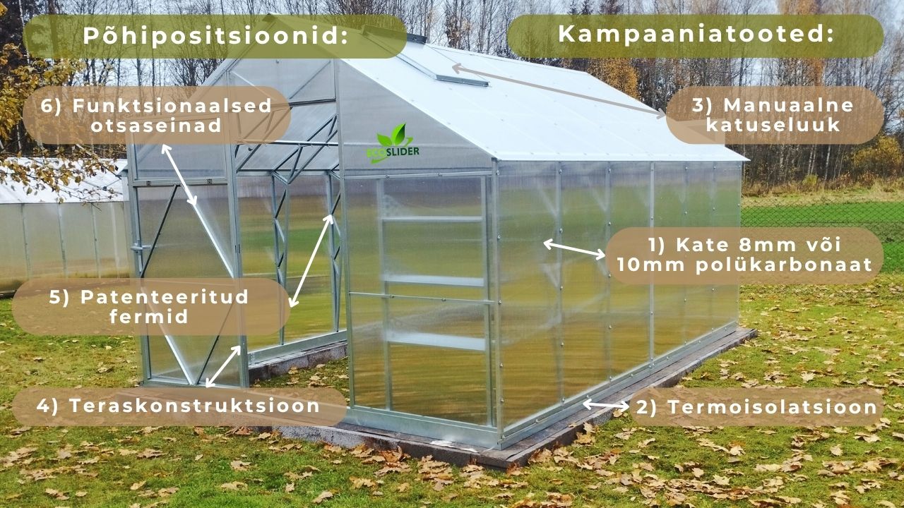 Pakkumine sobib eriti hästi neile, kellele meeldib aiandushooaega varakult alustada ja hilja lõpetada. Kampaaniatoodete konstruktsioon on parendatud, et hoida soojust kasvuhoones kauem.