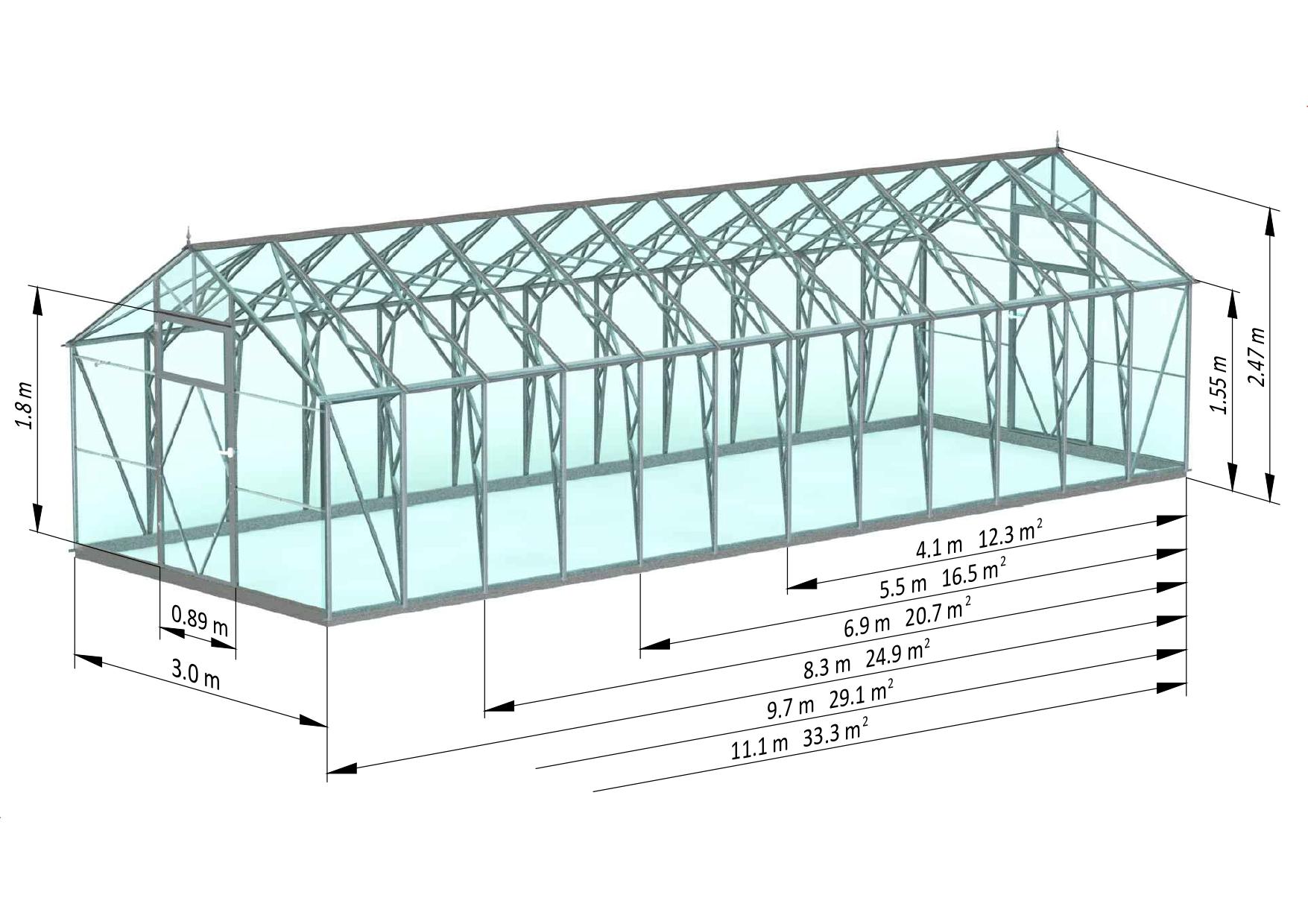 - Musta värvi teraskarkass on tugevdatud fermidega, tänu millele peab kasvuhoone vastu lumekoormusele kuni 800 kg/m². Katust ei ole vaja lumest puhastada.