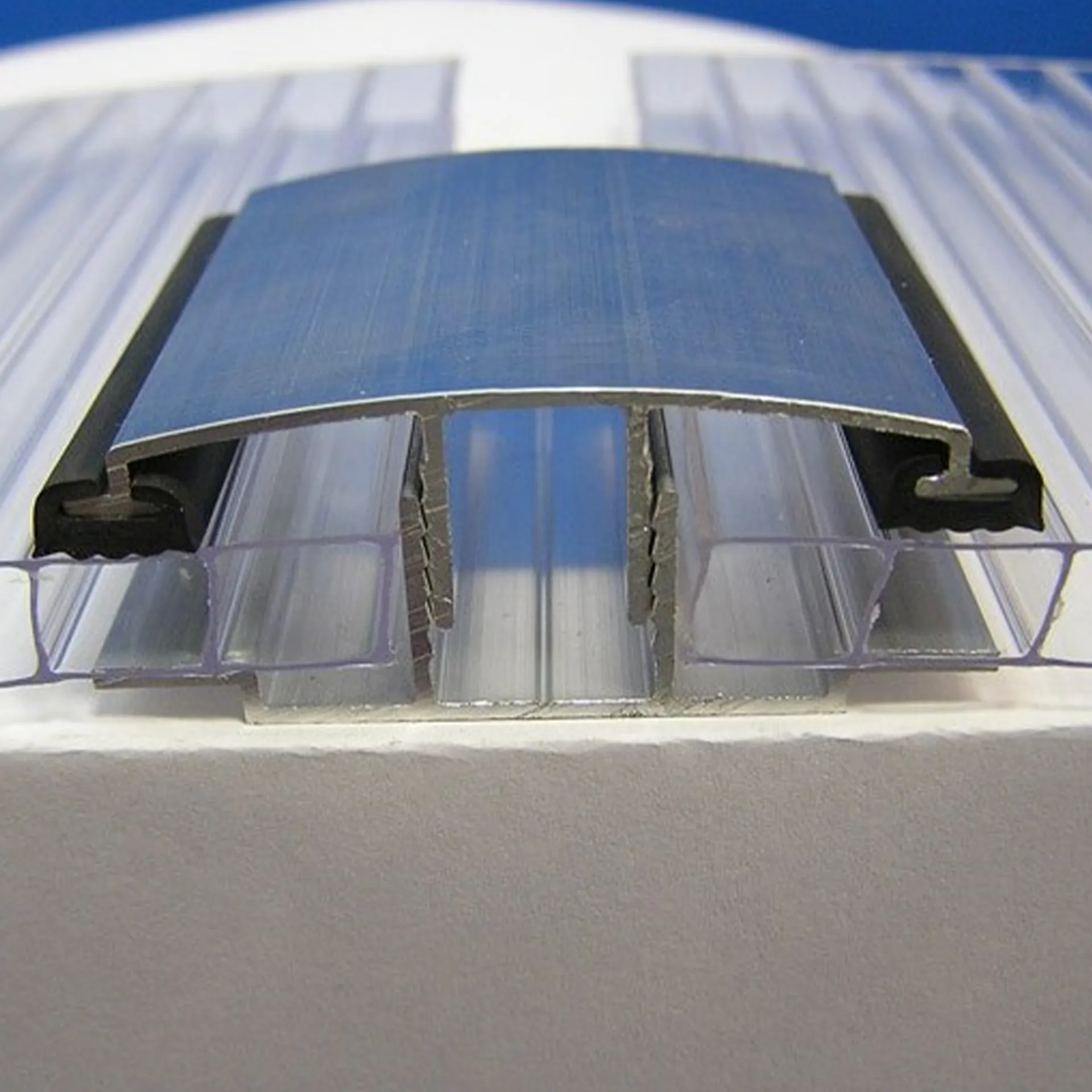 Aluminum pressure profile with rubber seals on the edges. Size: thickness 60 mm x width 2100 mm x length 6000 mm. For polycarbonate 6 mm / 8mm / 10mm / 16 mm.