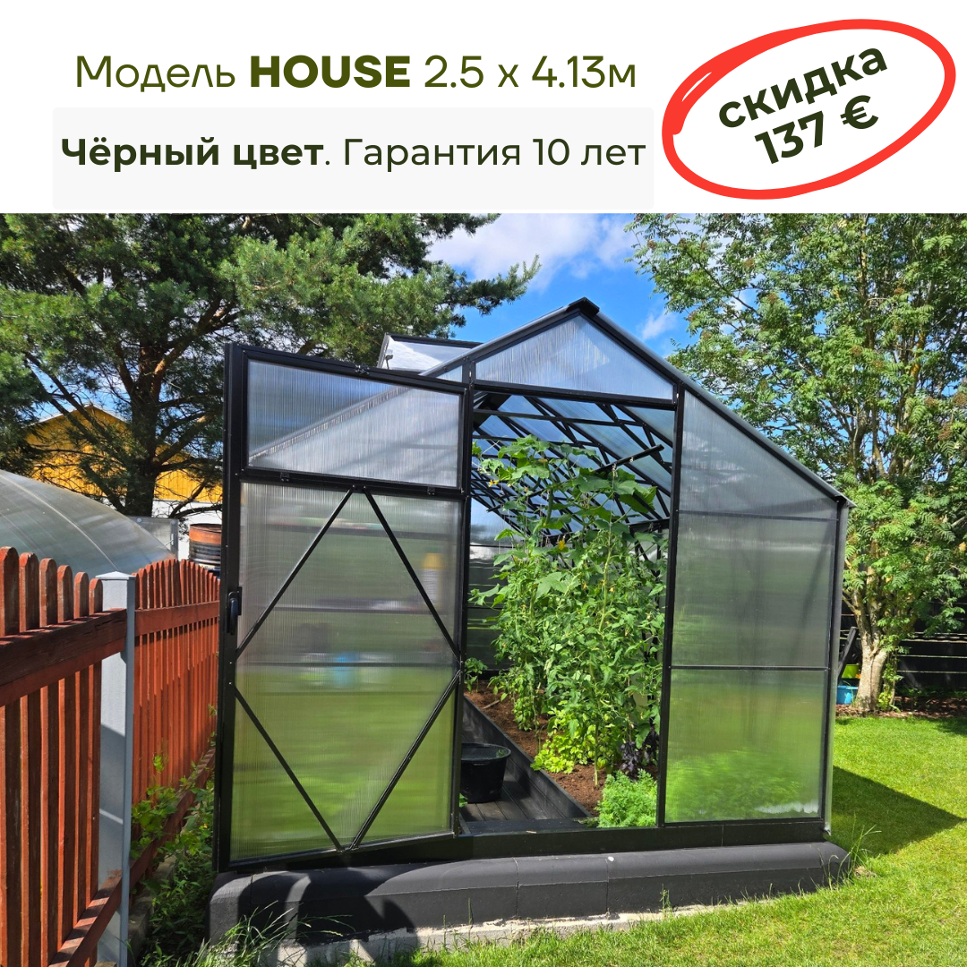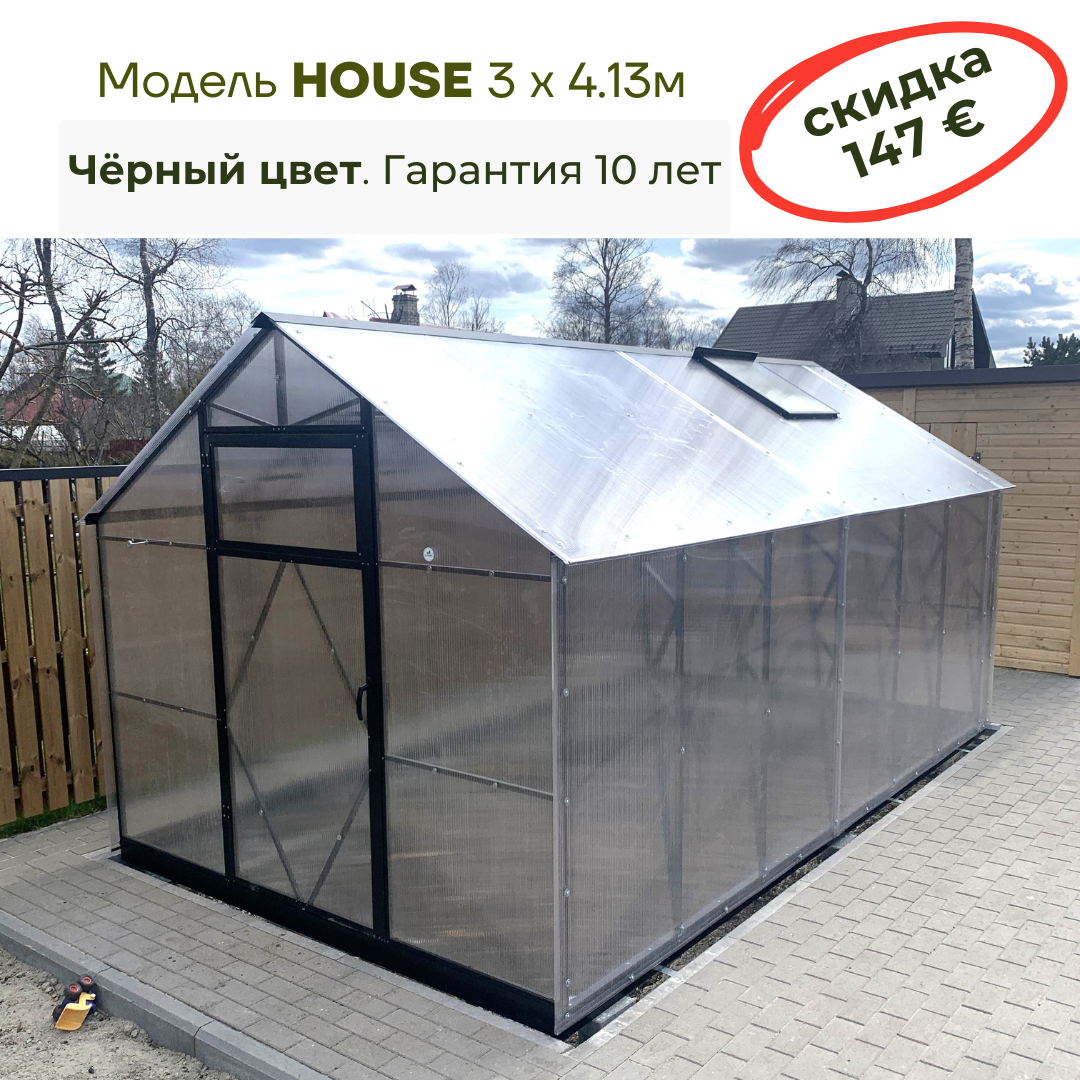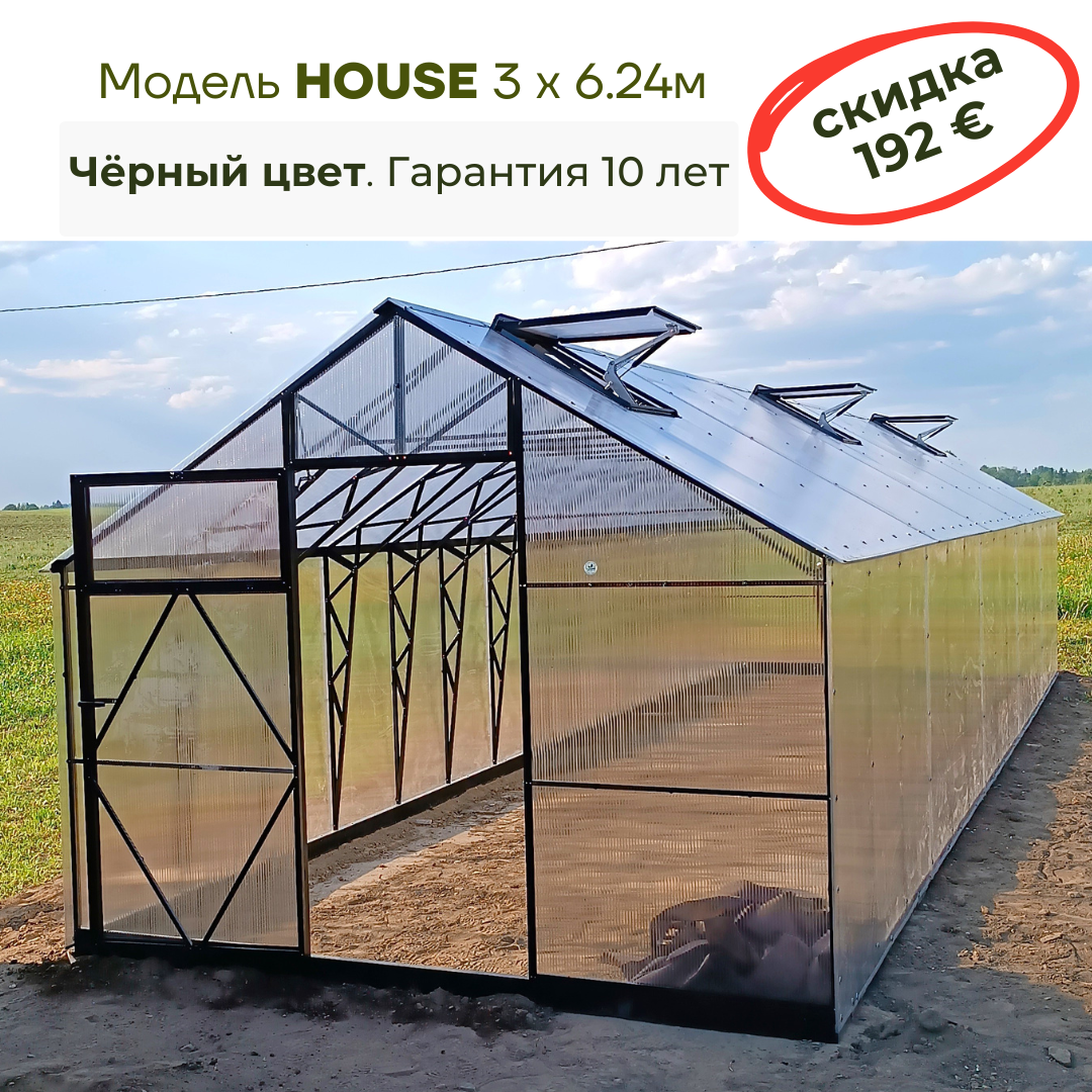 Особенность модели: - Любимые размеры в черном цвете: 2.5х4.13м, 3х4.13м, 3х6.24м, 4х8.35м. - Покрытие — сотовый поликарбонат с УФ-защитой: торцы - 6мм, стены и крыша - 6мм / 8мм / 10мм. - Скидка на теплицу -10%. - Дополнительно: установка со скидкой -25%.