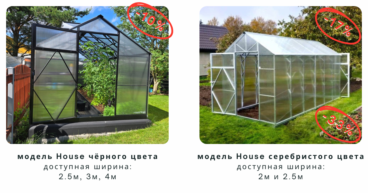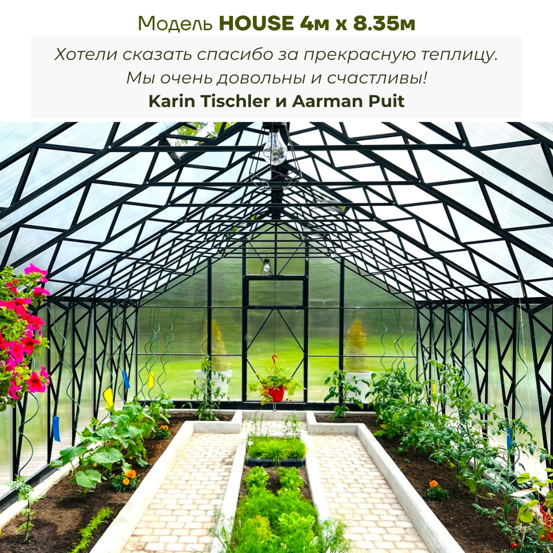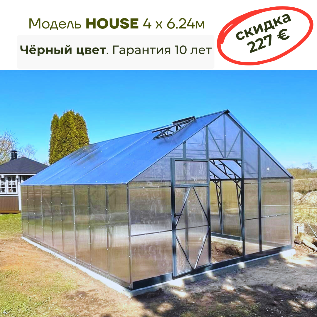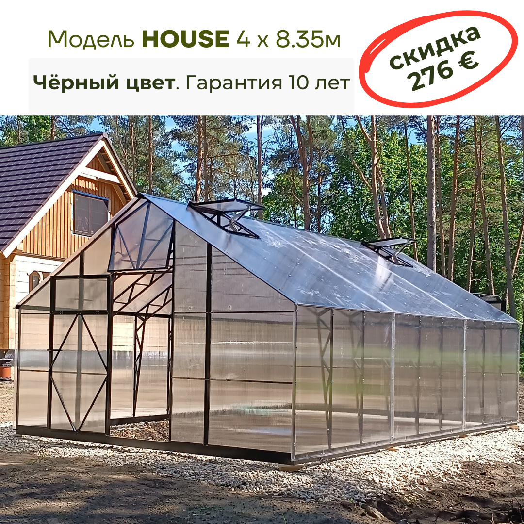Особенность модели: - Любимые размеры в черном цвете: 2.5х4.13м, 3х4.13м, 3х6.24м, 4х8.35м. - Покрытие — сотовый поликарбонат с УФ-защитой: торцы - 6мм, стены и крыша - 6мм / 8мм / 10мм. - Скидка на теплицу -10%. - Дополнительно: установка со скидкой -25%.