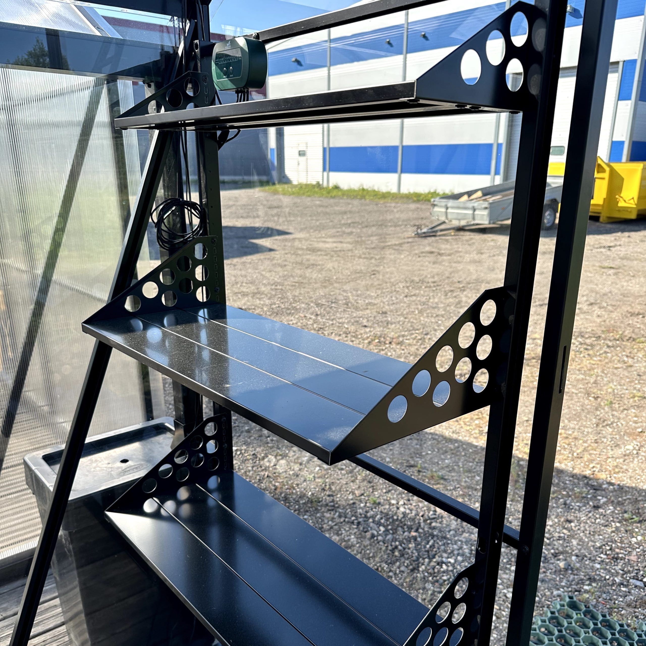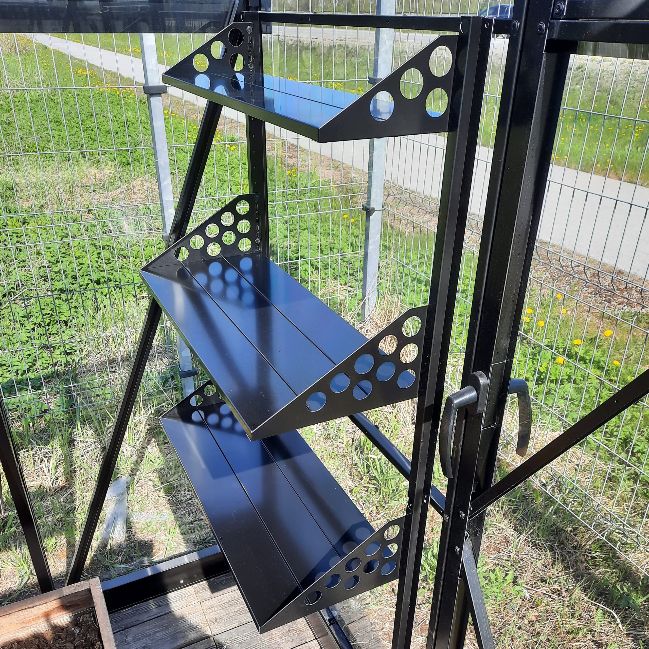 Комплект изготовлен из прочной стали с антикоррозийным покрытием, окрашенный в черный цвет. Идеально подходят для двускатных теплиц модели House Lux. Легко крепятся к каркасу и выдерживают регулярную нагрузку от инвентаря и растений.