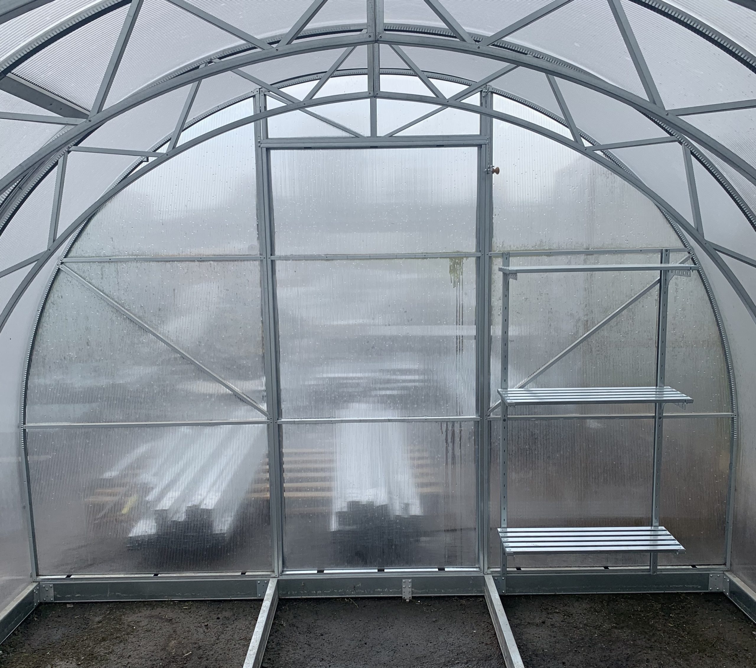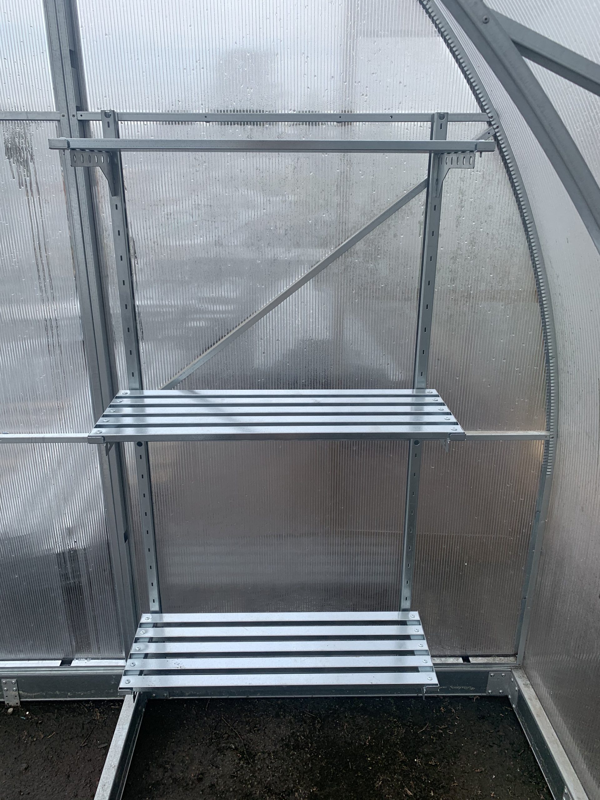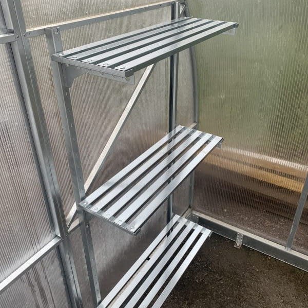Комплект изготовлен из прочной стали с антикоррозийным покрытием и не требуют покраски. Они подходят как для арочных теплиц Slider, так и для двускатных теплиц House, легко крепятся к каркасу и выдерживают регулярную нагрузку от инвентаря и растений.