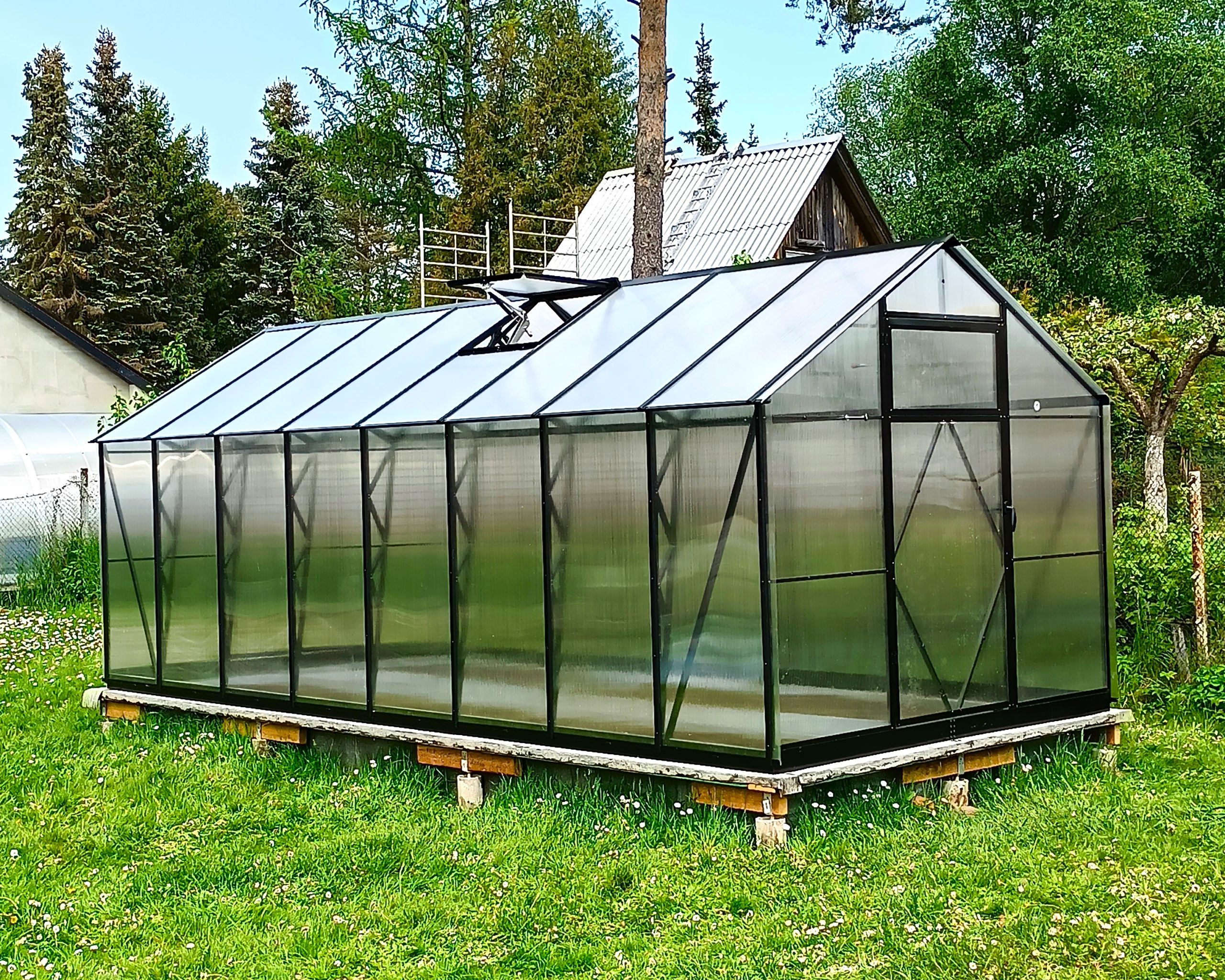 Meet the Ecoslider House Lux 2.5×5.5m (area 13.75 m²) — the black pearl of your garden, where every gardener’s vision can come to life. The sleek black House Lux is more than a greenhouse; it’s a versatile, reliable home for your plants and a comfortable space to explore your creativity. Inside, you can arrange standard or tall beds, install shelves, add plant supports, or hang decorative pots — whatever your ideas, this gable roof greenhouse provides the room to bring them to reality. Built from robust steel, the structure is engineered for northern climates with heavy snow and strong winds. Stability is assured by the foundation frame, reinforced end walls, patented trusses that evenly distribute loads, and secure fastening elements — ensuring that your greenhouse remains strong and dependable year after year. Time spent in the greenhouse is always more enjoyable with carefully designed ventilation. Two end doors, windows in the doors, ventilation hatches at the top of the end walls, and two manually operated roof vents allow you to create the perfect microclimate for vegetables, greens, and flowers, promoting healthy, thriving plants.