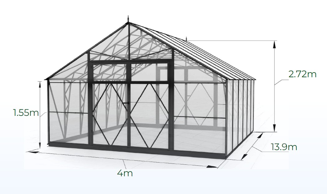The House Lux 4×13.9m (area 55.6 m²) embodies the essence of premium cultivation. Wide walkways, abundant planting beds, and a balanced climate let you grow confidently without compromise. Its rich black frame is visually striking — a bold architectural piece that commands attention in any garden or estate. With double doors at both ends and 7 manually operated roof windows, fresh air flows effortlessly through the structure, ensuring healthy crops and a serene working environment. Ideal for botanical collections, long vegetable rows, or layered seasonal gardens — the House Lux 4 × 13.9 m stands ready.