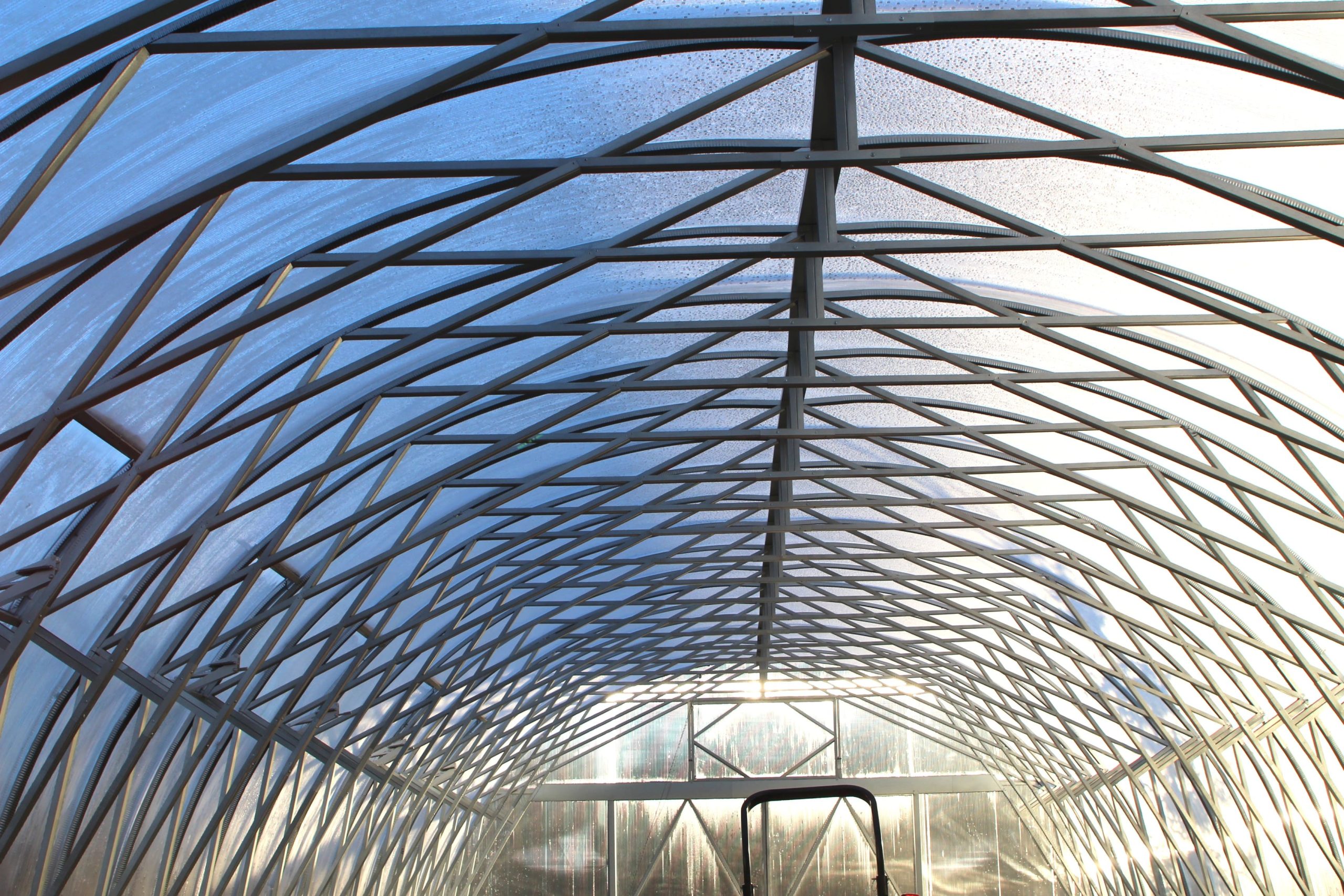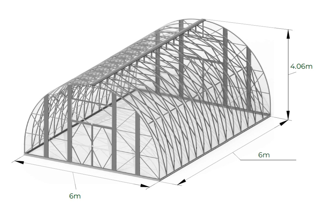 The Model Ecoslider Slider 6x6m (area 36 m²) — a compact industrial arch greenhouse designed for farmers, nurseries, and professional growers who need predictable yields, stable microclimate, and equipment-ready space. With a height of 4.06 m and a width of 6 m, this model efficiently uses every square metre: there is enough volume for tall crops, shelving, and climate equipment while keeping the footprint manageable for small and medium farms. The silver galvanized frame and industrial-grade polycarbonate are built for year-round use, from early seedlings to late-season production. This 6x6m module is an ideal starting unit for intensive vegetable production, flower growing, or starter plants for open fields. It integrates easily with irrigation, heating, and automation systems, and thanks to its strong structure and 10 mm roof polycarbonate, it maintains a stable climate even in harsh weather. Six roof ventilation windows and wide doors provide effective natural ventilation and convenient access for daily work, carts, and small machinery.