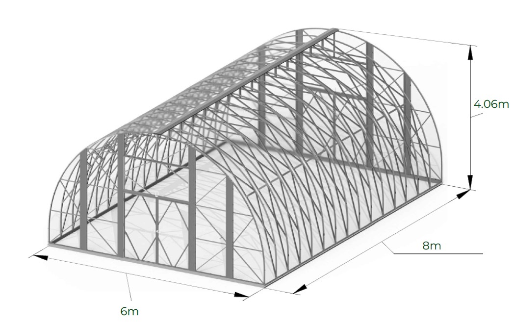 Meet the Ecoslider Slider 6x8m (area 48 m²) — an extended industrial arch greenhouse for farms and professional growers who need more production space without compromising on climate stability or reliability. With a width of 6 m, a length of 8 m and a height of 4.06 m, this model offers enough volume for tall crops, overhead irrigation, shelving and climate equipment. The silver galvanized frame and professional polycarbonate envelope are designed for intensive use and year-round production. This 6x8m modele is ideal for commercial vegetables, herbs, starter plants, flowers or test blocks in a larger system. Eight roof ventilation windows and wide doors with 2 Smartventor vent in ends ensure efficient natural ventilation, easy access for workers, carts and small machinery, and precise microclimate control.