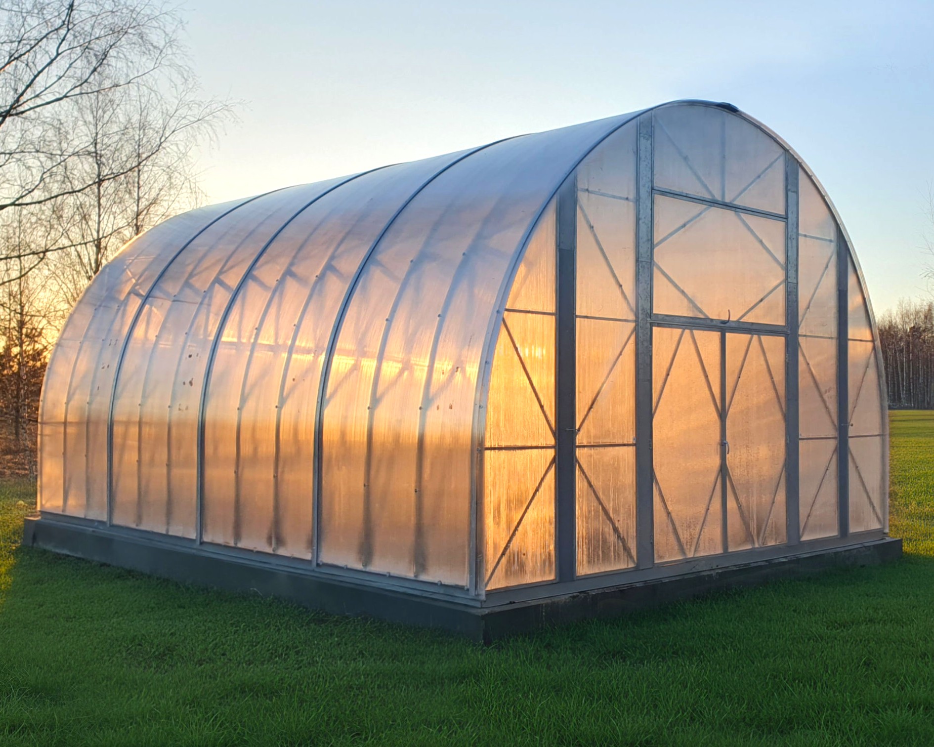 • Industrial steel frame: Galvanized steel with 275 g/m² zinc — high corrosion resistance and long service life in demanding conditions. The galvanized frame gives the greenhouse a pleasant silver color.
